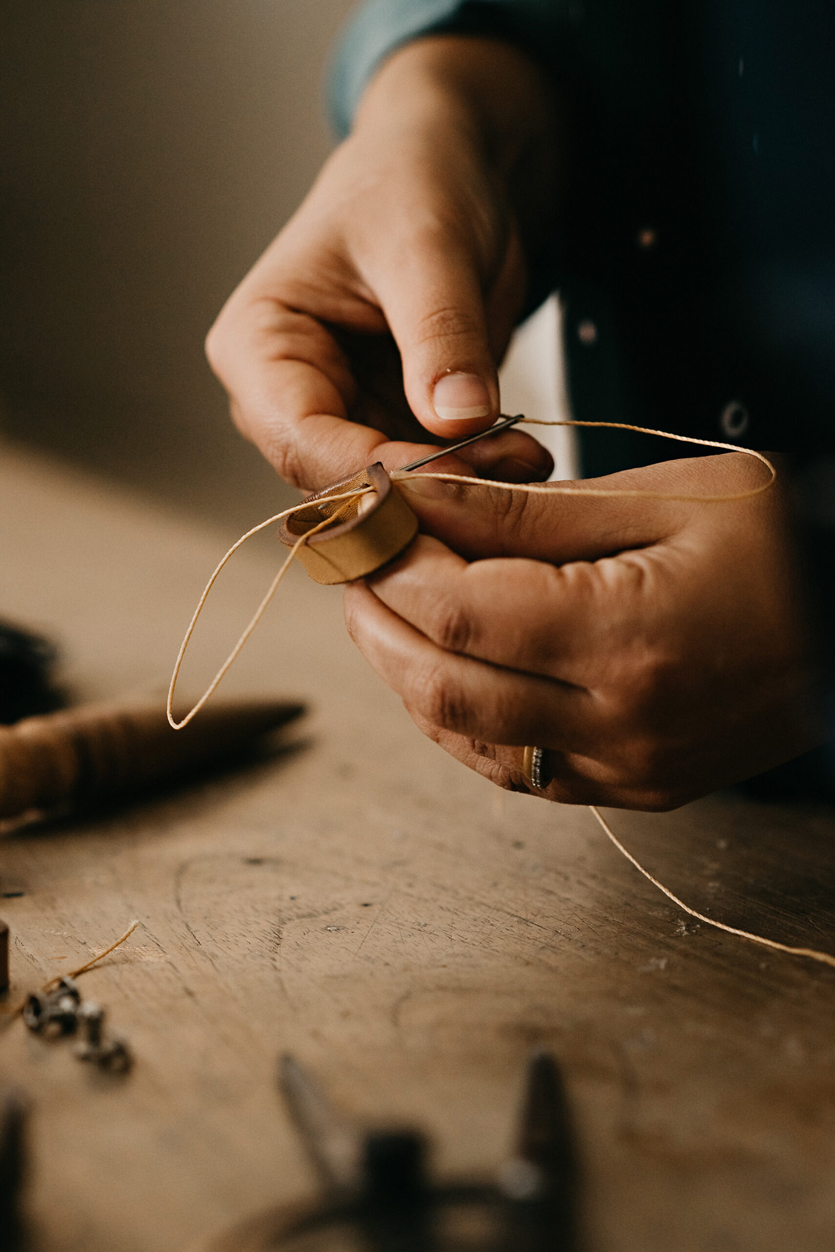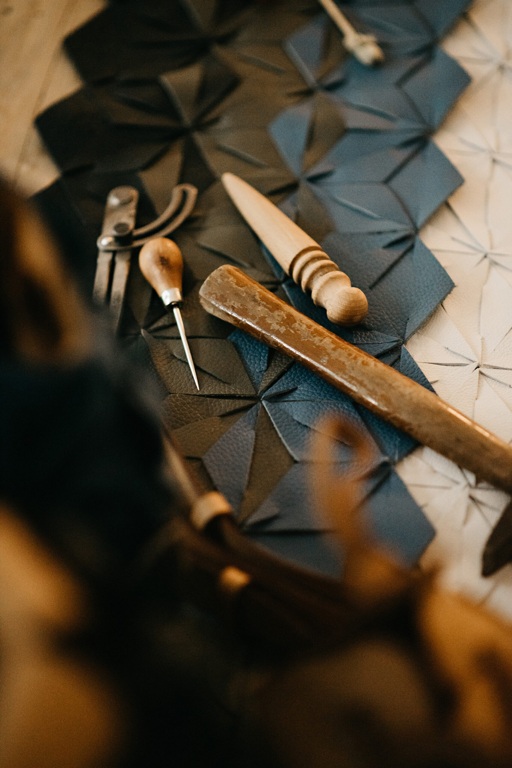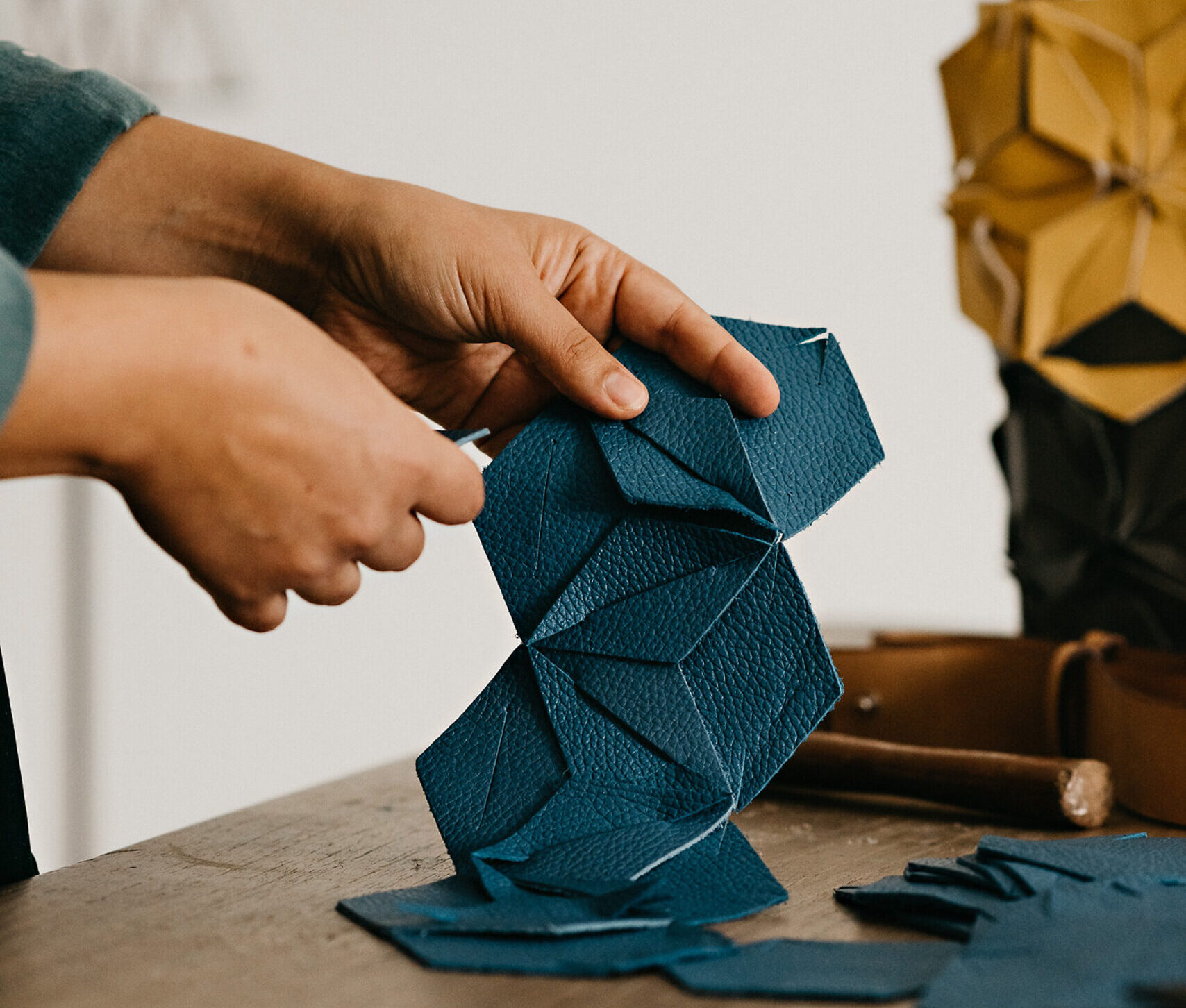 a mão, essa que toca o material, sente a textura, alinha a régua, com precisão comanda o estilete que corta o material; depois de um suspiro, passa a linha pela agulha e, ponto a ponto, a peça nasce, ganha suas formas próprias, sua identidade, sua personalidade.